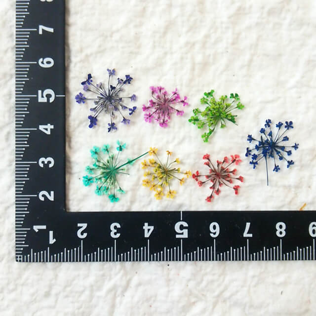 【S-704】押し花 着色レースフラワー新色エメラルドグリーン入り35枚エメラルド、ピンク、紫、赤、緑、黄、青の7色飛騨のお花屋さんが手作りしました。安全安心の国産品質です。