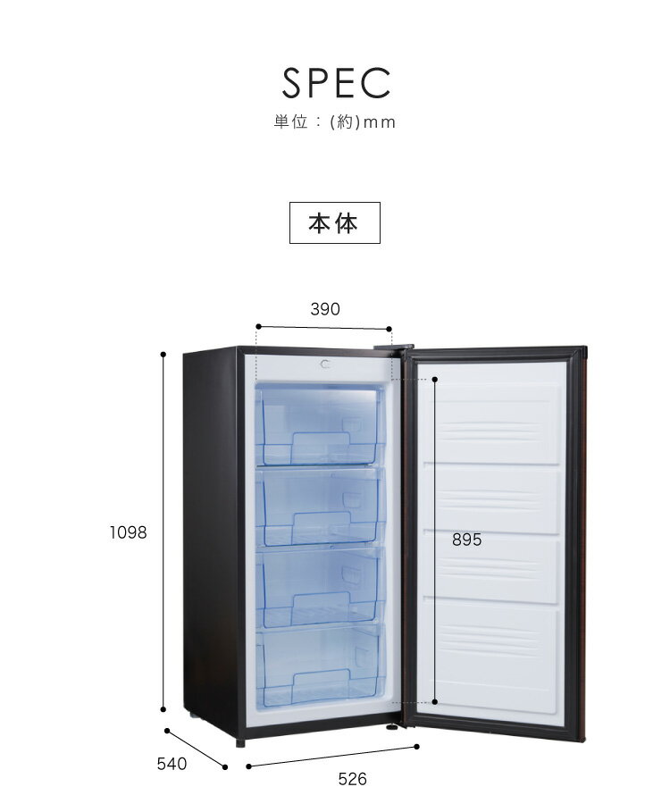 冷凍庫 1ドア 前開き 119L SP-119F1-WD ダークウッド 木目調 直冷式JANコード:4589668475338■庫内の整理がしやすい前開き冷凍庫■奥の物も取り出しやすい引き出し付電源:AC100V・50/60Hz定格電流:2.0A消費電力量:310KWh/年(50/60Hz共通)電源コードの長さ:約2.0m冷蔵方式:直冷式冷媒:R600a質量:35Kg定格内容積:119L寸法:幅526mm×奥行540mm×高さ1098mm付属品:霜取用へら、取扱説明書(保証書付き)〇動作時静音性(約):43dB〇一日当たりの電気代/年間電気代(約):23円/日 8,370円/年〇天板耐熱温度:100℃〇冷凍室の性能(JIS規定による)記号:フォースター冷凍室負荷温度:-18℃以下冷凍食品の保存期間の目安:約3ヶ月※保存期間は食品の種類、冷凍室に入れるまでの温度、使用条件などにより違いますので、一応の目安としてご覧ください。