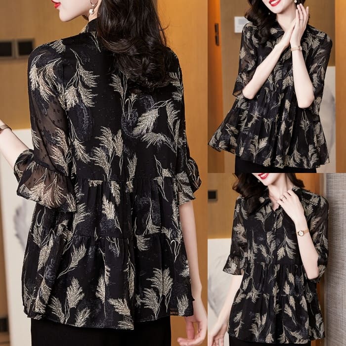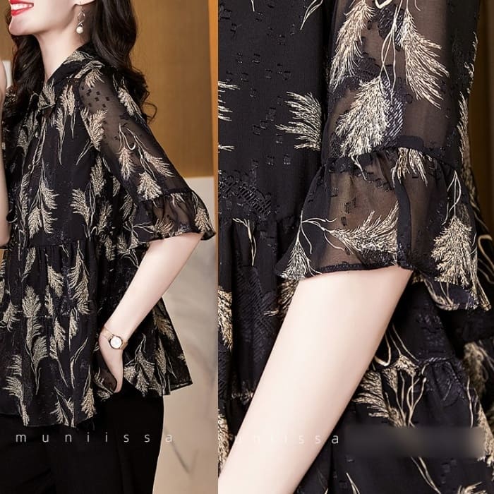 注目キーワード きれいめレディースファッション 韓国ファッション レディース 大きいサイズ プラスサイズ 半袖 S/M/L/XL/2XL/3XL トップス シアーブラウス シャツ シースルー 透け感 シフォン 五分袖 5分袖 襟つき 襟 総柄 羽 フェザー柄 大人 薄手 エレガント 上品 体型カバー お腹カバー 30代 40代 50代 ミセス 黒 ブラック 高級感