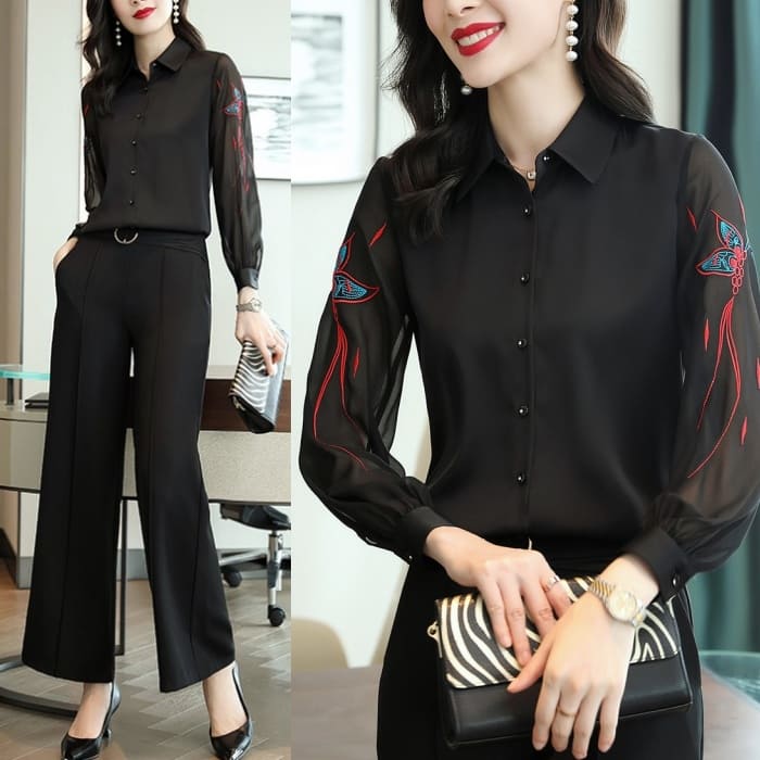 注目キーワード きれいめレディースファッション 韓国ファッション レディース 大きいサイズ S/M/L/XL/2XL/3XL/4XL セットアップ 上下セット 2点セット トップス シャツ ブラウス シアーシャツ シアー シースルーシャツ シースルー 袖コンシャス 刺繍 刺しゅう ボトムス パンツ ロングパンツ フルレングス ハイウエスト ワイドパンツ 美脚 脚長 体型カバー 着痩せ 細見え 上品 きれいめ エレガント 華やか シック OL オフィス お出かけ お呼ばれ 20代 30代 40代 50代 ミセス おしゃれ 黒 ブラック 春 秋 春服 秋服