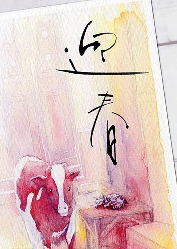 (『 迎春 』の文字は、作家の書 ) インドのバラナシで出会った子牛。