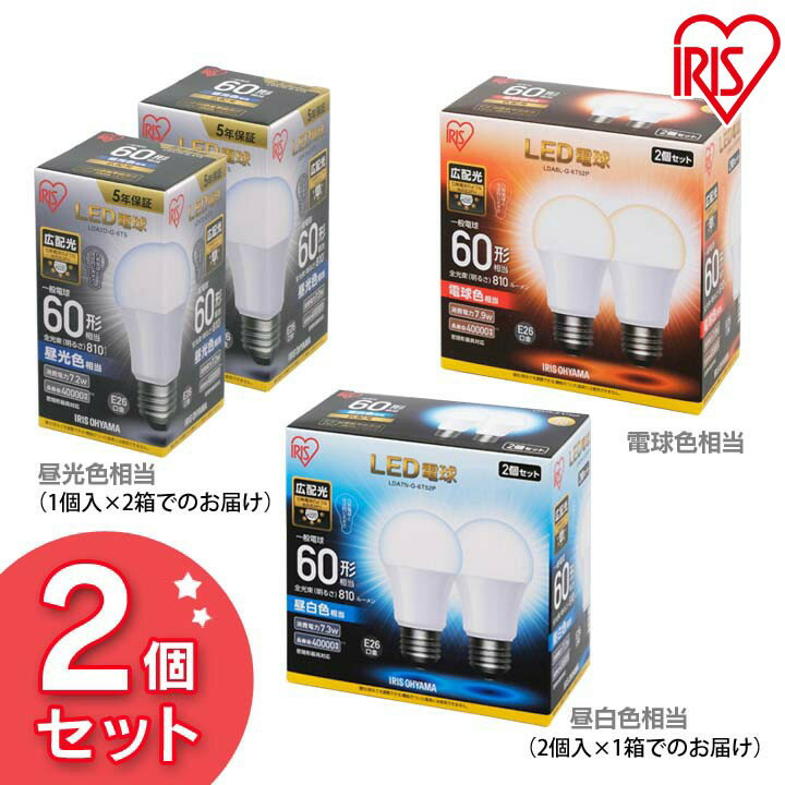 【2個セット】電球 LED E26 アイリスオーヤマ 60W LDA7D-G-6T5 LDA7N-G-6T5 LDA8L-G-6T5 電球色 昼白色 昼光色 広配光 密閉形器具 電球のみ 電球 26口金 広配光タイプ 60W形相当 LED 照明 省エネ 節電 パック 5年保証